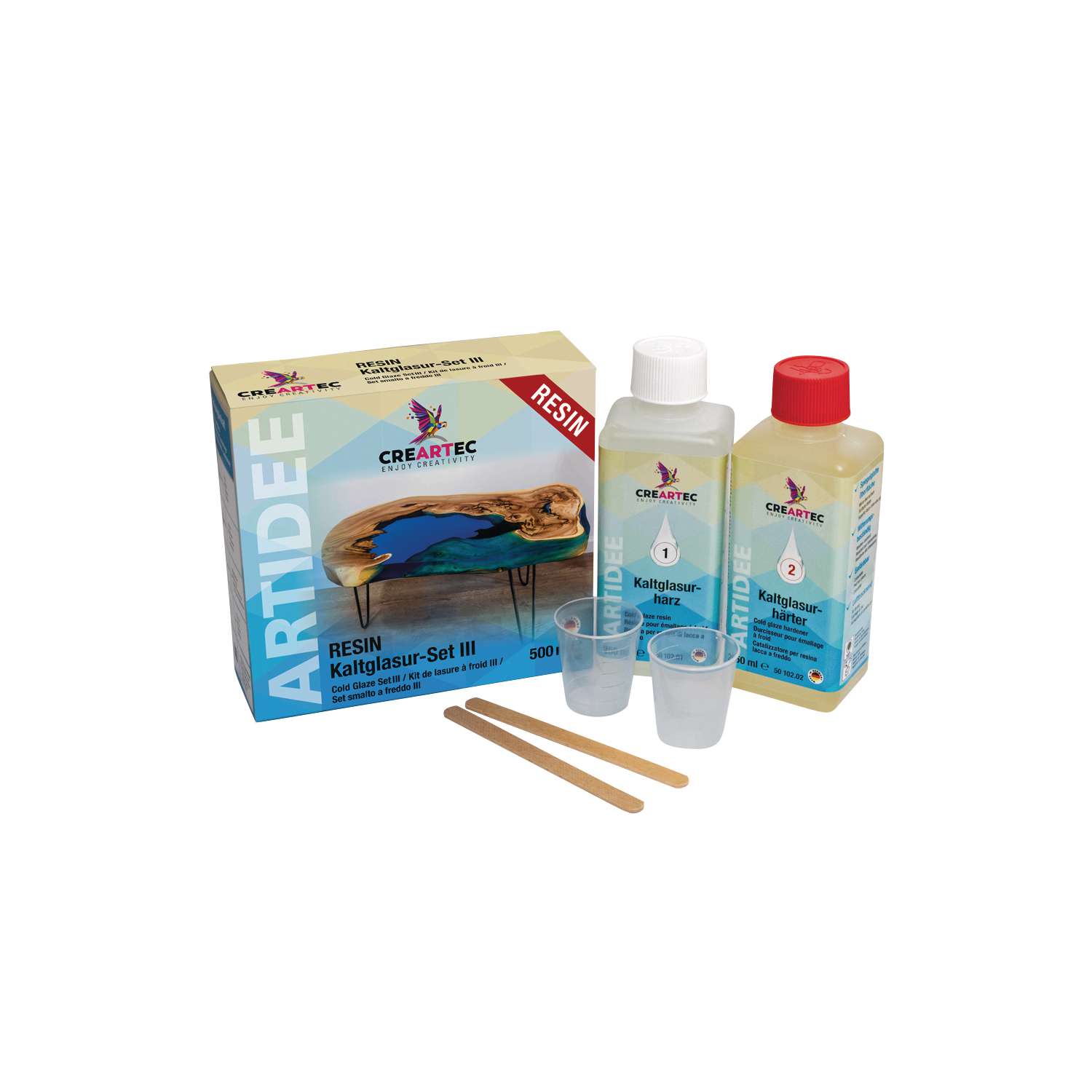 Het pakket bevat 1 fles koudglazuur verharder, 1 fles koudglazuur hars, 2 meng- en maatbekers en 2 spatels. Uitvoerige informatie over de verwerking en gebruiksmogelijkheden wordt meegeleverd in de talen Engels, Duits, Frans, Spaans en Italiaans. Verkrijgbaar in 2 verschillende verpakkingsformaten. Prijs per set.