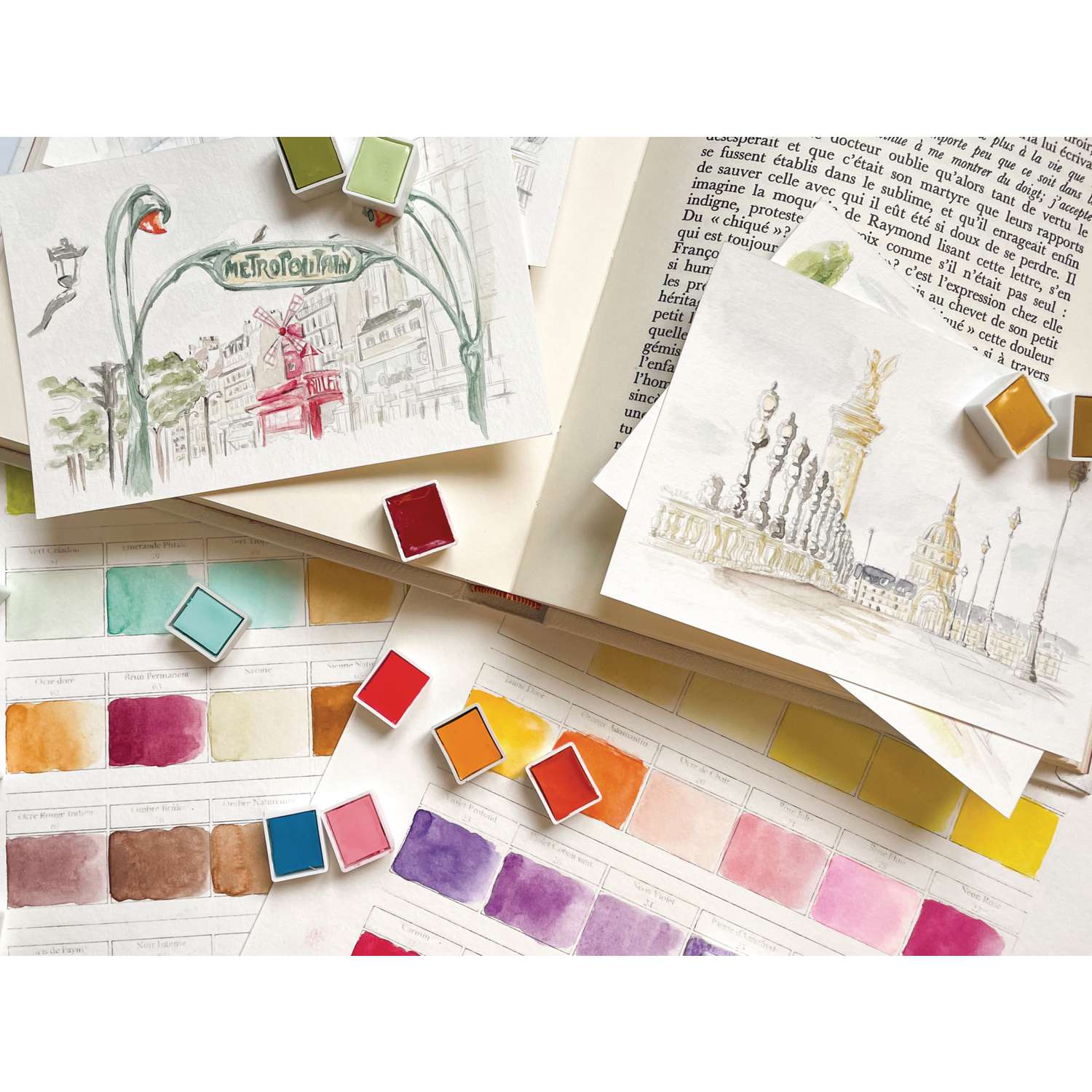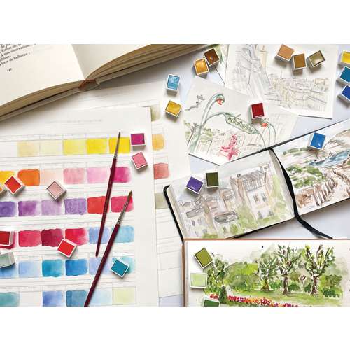 Deze aquarelverf wordt op de traditionele manier gemaakt in kleine batches. Het bindmiddel is Arabische gom. Hij droogt eerder glanzend op. Je kunt er goed laag-over-laag mee werken, zónder dat de onderliggende laag meteen weer geactiveerd wordt.