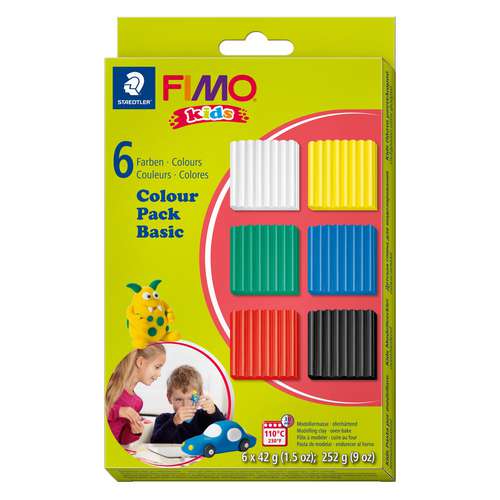 FIMO® Kids Colour Pack "Basic" " bevat 6 pakjes boetseerklei à 42 gr in de kleuren: