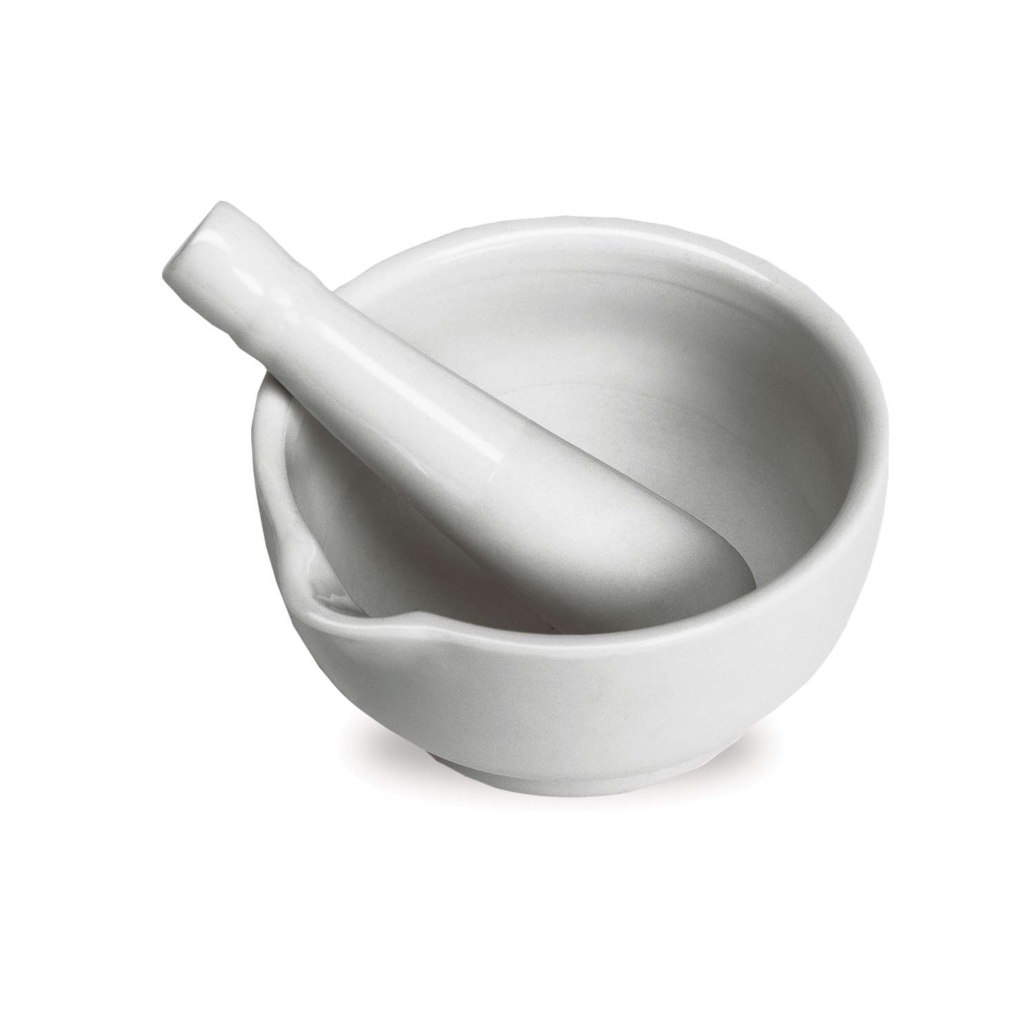 Vijzel gemaakt van hard porselein, voor het zelf wrijven van verven. Diameter ca. 12cm, hoogte ca. 7,5cm. Inclusief stamper. Prijs per set. Meer