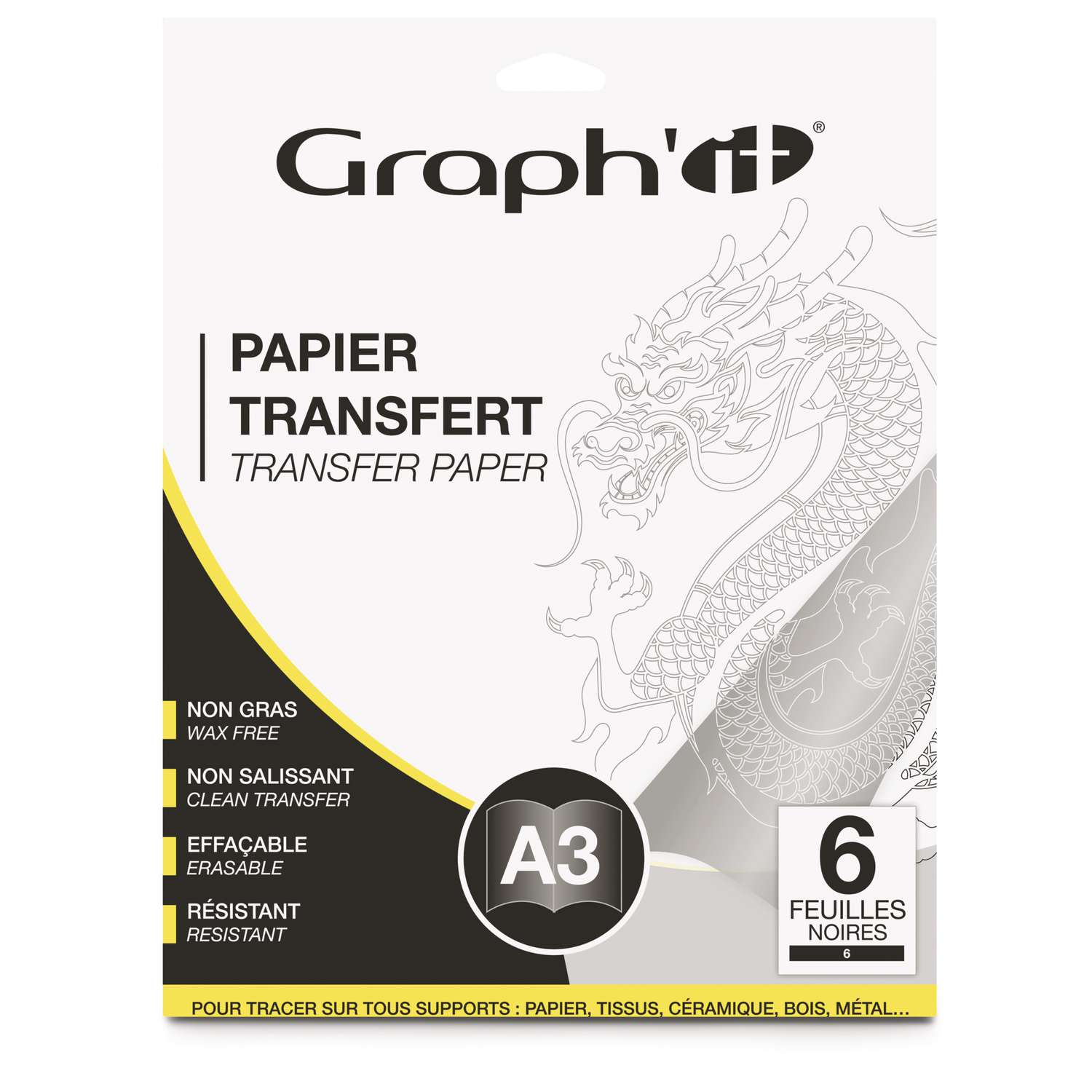 Het transferpapier is ideaal voor talrijke ondergronden, zoals papier, stof, keramiek, hout, metaal, enz. Het papier is herbruikbaar en verkleurt niet. Het is resistent, vrij van was en gemakkelijk uitwisbaar. Het kan ook gemakkelijk op maat worden gesneden indien nodig.