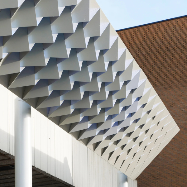 Acoustic cladding increases the comfort in dense cities with traffic. This 3d-shape was created with the same material as was used for Theater Zuidplein. With the use of folding, this aluminum composite material becomes a expressive texture. This project shows the potential of 2D-milling in three-dimensional expressive facades. This technique could be used in many more projects with different parameters and free-form patterns. The silver material has an impressive blue glow that emphasizes the gradient of the acoustic spikes.