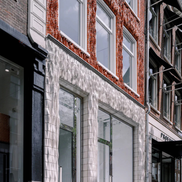 Studio RAP was commissioned to contribute to this architectural renaissance by creating a 3D-ceramic printed facade. This project involved reimagining the traditional cross-bond brick pattern by integrating stainless steel joints and expressive 3D patterns into the design. To achieve this, Studio RAP developed a novel printing setup capable of fabricating a large quantity of ceramic tiles necessary for the facade. This innovative approach not only highlights the merging of traditional and contemporary design elements but also showcases the potential of 3D printing technology in modern architecture. The result is a striking and unique facade that adds to the street's visual and architectural diversity.