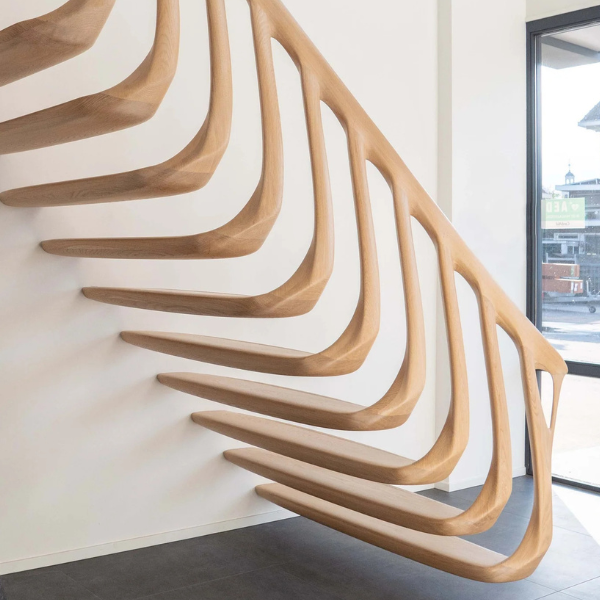 This bespoke timber staircase stands at the entrance of 3D-milling expert Doornekamp Woodspecials in Waddinxveen. Parametric tools proved ideal for designing its organic form. For this project, we developed a Grasshopper script to generate the steps and balusters, transforming their shapes from top to bottom. Rhino’s SubD functionalities enabled the creation of a polysurface tailored to this unique design. The staircase exemplifies the synergy between parametric design and digital fabrication. Spline modeling with SubD aligned perfectly with the capabilities of the 5-axis milling machine. Supported by a steel frame within its wooden envelope, the staircase maintains remarkable stiffness and remains vibration-free despite its slender profile.