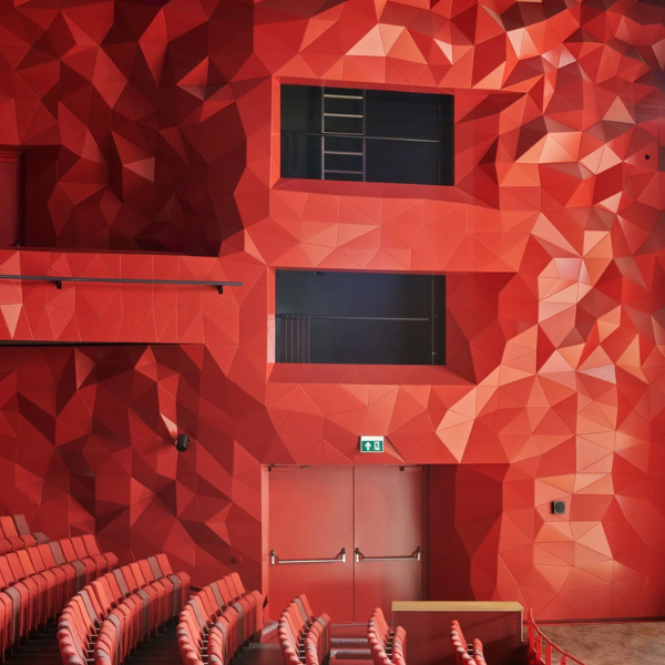 The interior of Theater Zuidplein represents a harmonious blend of advanced generative acoustic simulation and innovative robotic 2D-milling and folding techniques applied to sheet metal. The parametric design process begins by selecting a fixed unit governed by a specific set of rules. For this project, we developed a mesh of parametric triangles. Each triangle unit was informed and transformed through acoustic simulations to generate an optimal sound experience. These triangular units are not only structurally self-supporting but also engraved with detailed information to dictate their precise position, rotation, and folding angles.
