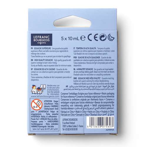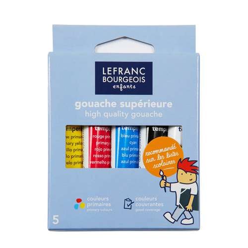 LEFRANC & BOURGEOIS Gouache set. Met 5 gouache kleuren in tubes à 10 ml. Geschikt voor een ruime hoeveelheid ondergronden zoals bv. papier, karton, gips, textiel.LEFRANC & BOURGEOIS Gouache set:hoge pigmentgehaltedroogt mat oppasteuszonder oplosmiddelwateroplosbaaruitwasbaargoed ...