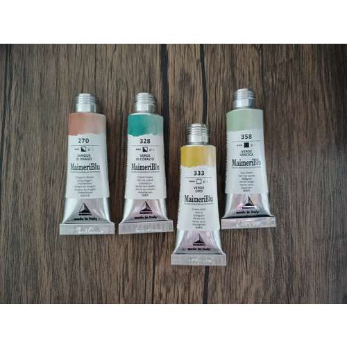 - 134 Golden ochre ○ 161 Raw Sienna ○ 250 Transparent mars red ○ 270 Dragon's blood ○ 296 Green earth ○ 318 Cobalt green blueish ○ 324 Cupric green deep ○ 328 Cobalt green ○ 373 Cobalt blue light ○ 374 Cobalt blue deep ○ 412 Turquoise cobalt ○ 440 Ultramarine violet ○ 467 Quinacridone violet reddish ○ 476 Mars brown ○ 479 Potters pink