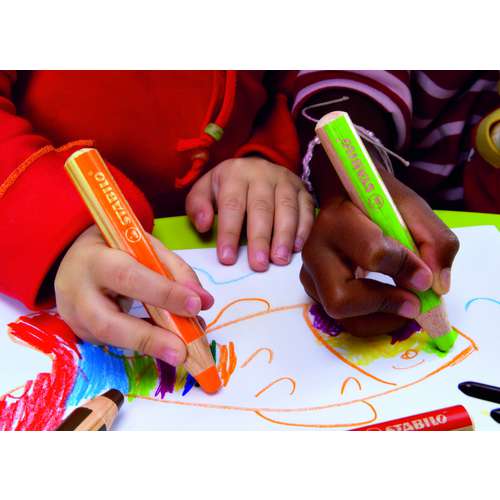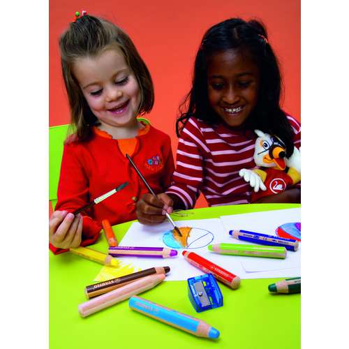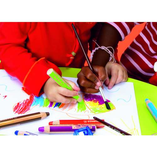 De Woody van Stabilo is een kleurpotlood, waterverf en waskrijt in 1! De potloden hebben een zachte, makkelijk afgevende dikke stift die zeer rijk is aan pigment. Heel geschikt voor gebruik op donker papier en gladde ondergronden en goed bestendig tegen breuk. Set met 10 Woody potloden in de kleu...