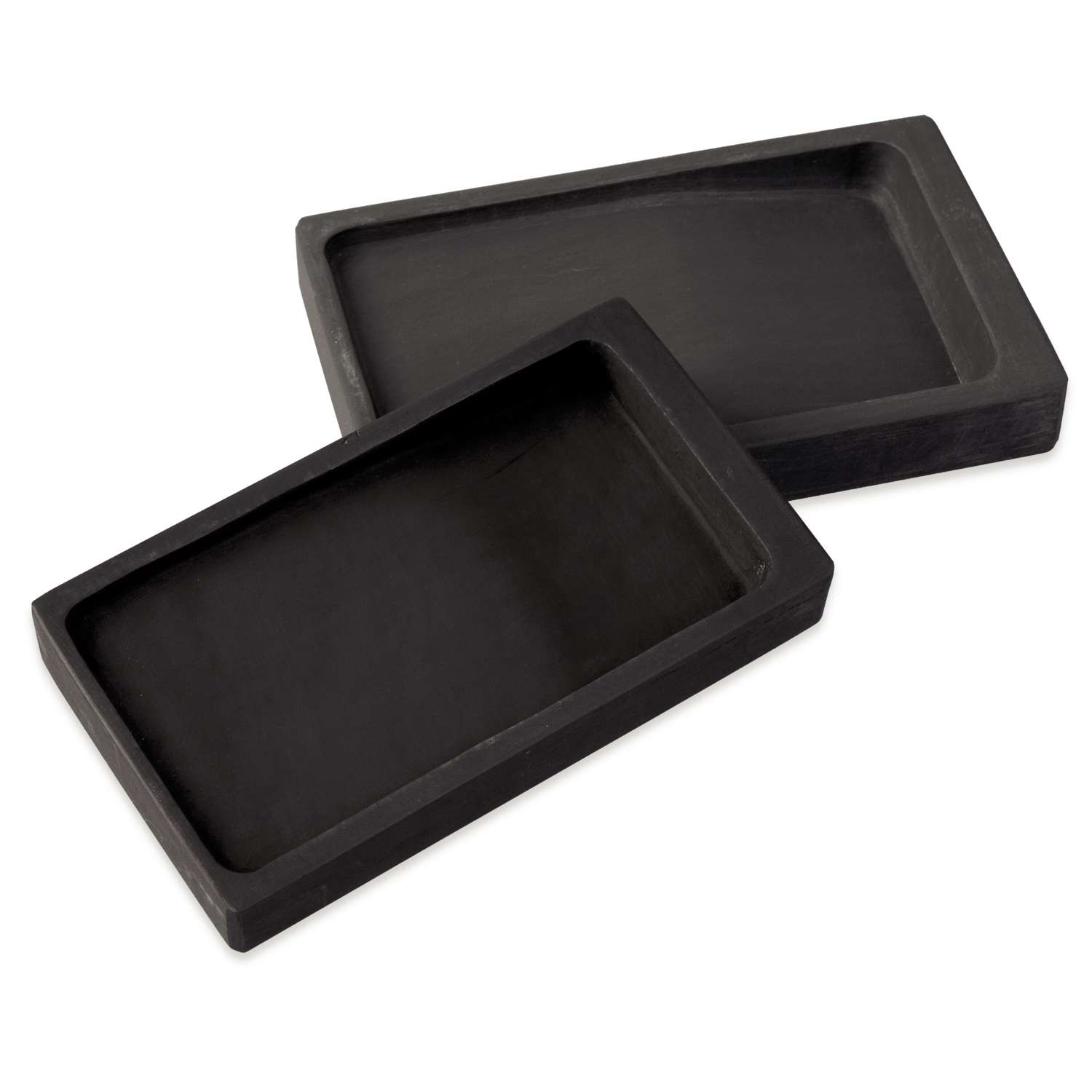Elk van deze twee formaten heeft een hoger gelegen, plat wrijfgedeelte — het deel waar je het inktstaafje aanwrijft tot vloeibare inkt — en een lager gelegen, schuin aflopend inktbad.